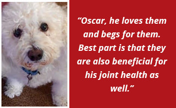 “Our dog recently had 10 teeth pulled on top of having a bad hip problem. Finding treats for him that he can enjoy has been hard, since many are hard. These have been a wonderful find. Not only are they soft enough for Oscar, he loves them and beg for them. Best part is that they are also beneficial for his joint health as well. ”